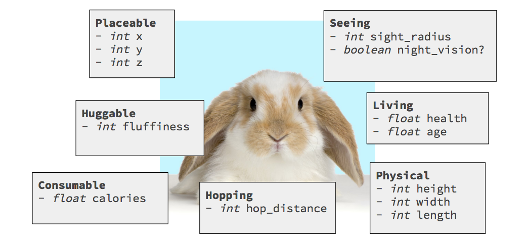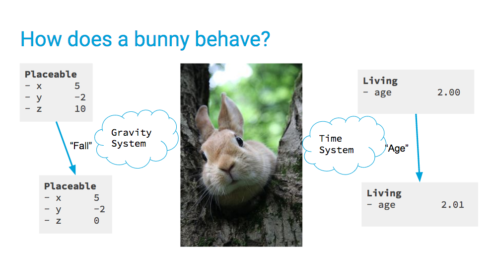 Chúng ta có thể biểu diễn đối tương Bunny với các component thể hiện tích chất của nó như Hopping, Seeing…