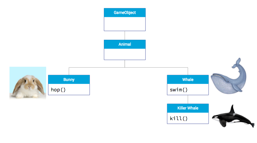 Chúng ta có thể thấy Animal có 2 lớp con là Bunny, Whale và Killer Whale là lớp con của Whale, với các phương thức khác nhau là hop(), swim(), kill(). Bài toán xuất hiện một đối tượng mới là BunnyKiller gồm 2 phương thức hop() và kill() vậy nó sẽ kế thừa từ Bunny hay là KillerWhale ???