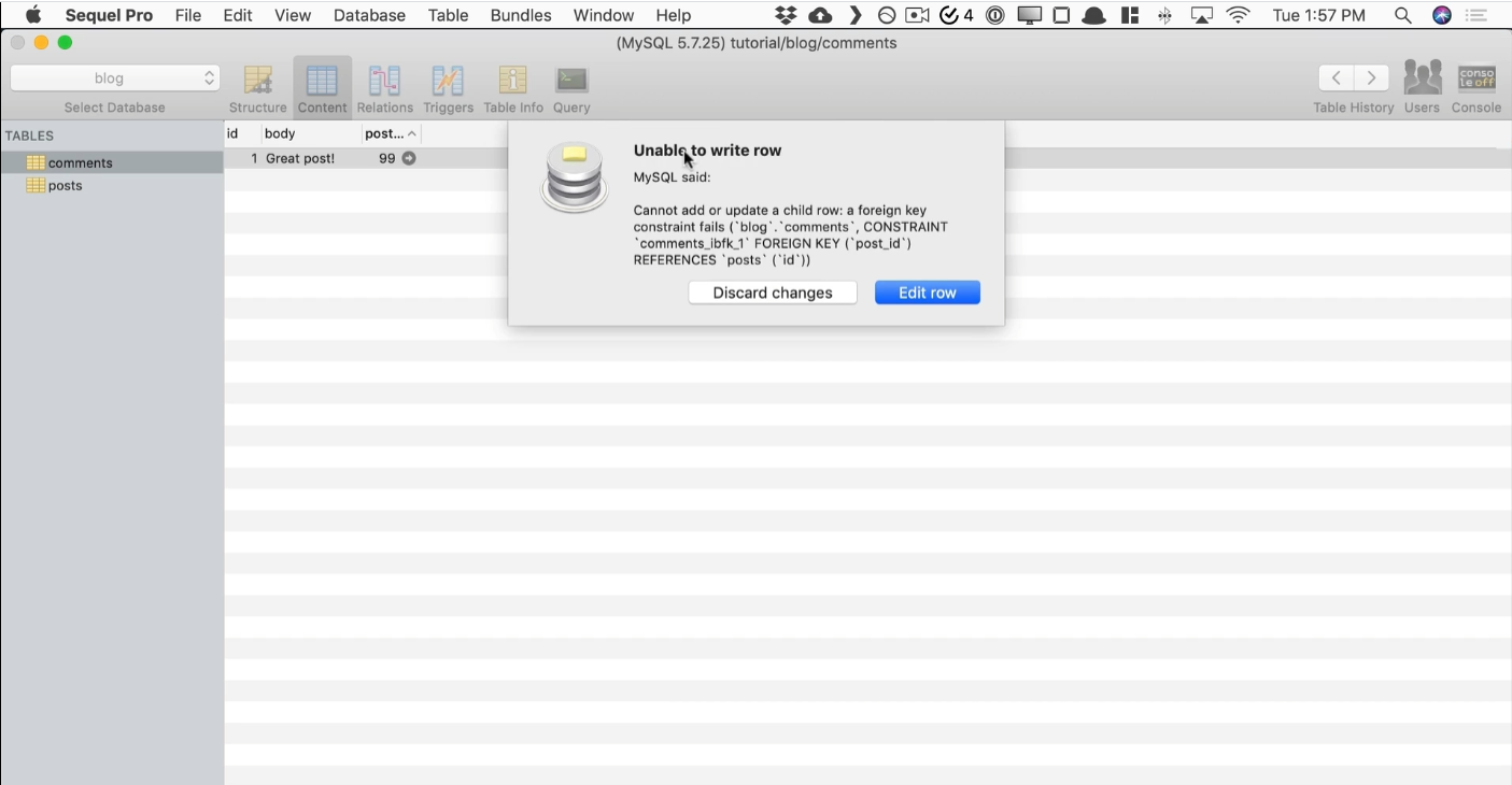 Như chúng ta thấy thì khi mình đổi post_id sang 99 thì dữ liệu vẫn đc save. Lý do là do chúng ta chưa có ràng buộc cho Foreign Key nhưng như vậy thì sẽ không tạo được tính chính xác cho dữ liệu