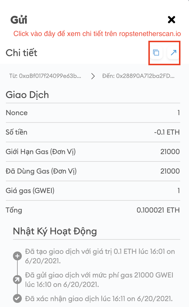 Sau khi hoàn tất quá trình giao dịch anh em có thể xem thông tin chi tiết giao dịch trên ropsten.etherscan.io như cách chúng ta đã làm ở các bước trên. Ngay lập tức có thể xem được thông tin giao dich, rất minh bạch và tức thời phải không anh em.