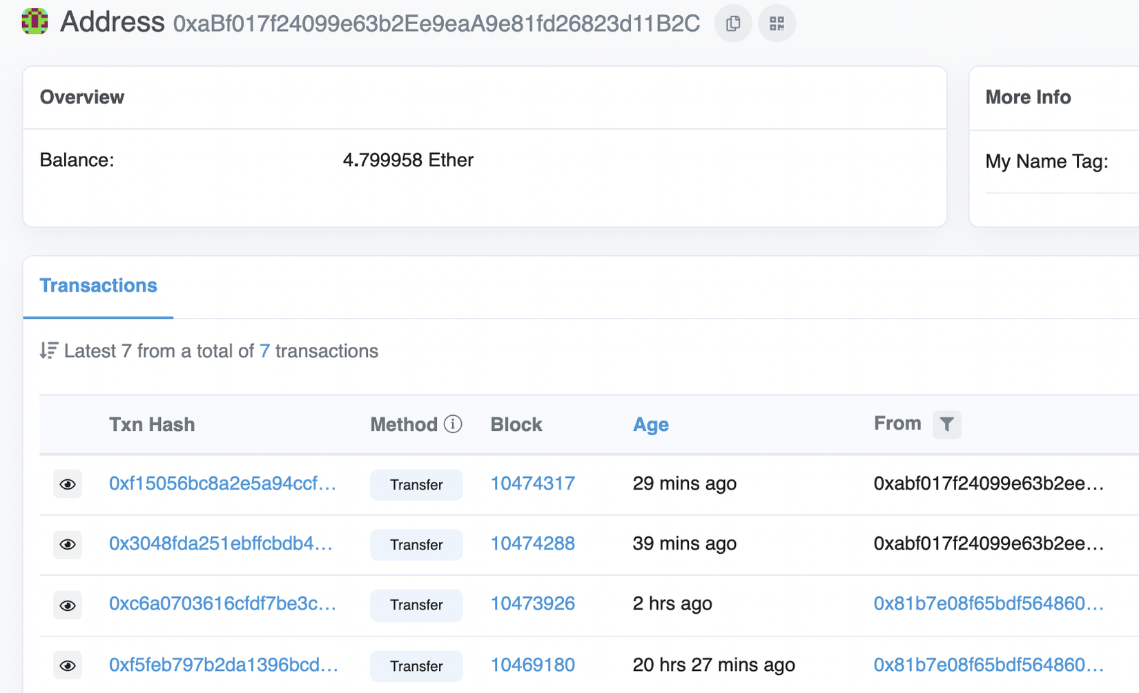 Như trong phần 1 tôi đã trình bày với anh em, MetaMask sẽ sử dụng chung 1 address cho cả mainnet và testnet vì thế anh em có thể kiểm tra các giao dịch liên quan đến 1 Address bất kỳ miễn là có địa chỉ Ethereum đó.