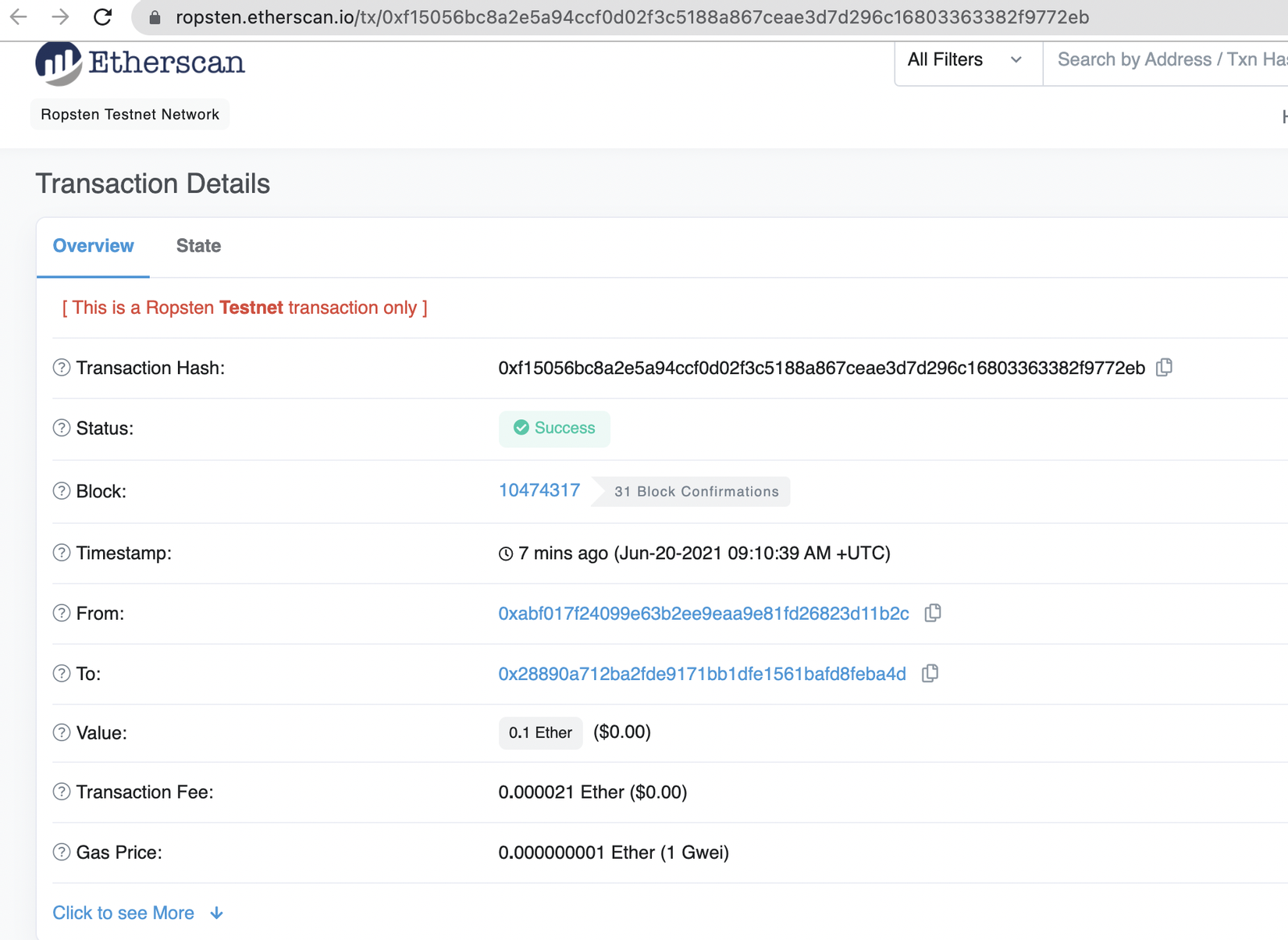 Như ở phần 1 chúng ta đã thực hiện việc nhận 1 ETH miễn phí ở testnet Ropsten. Sau khi nhận ETH từ faucet thì ngay lập tức sẽ có 1 transaction hash được hiển thị ở phần Transactions. (như ảnh dưới)