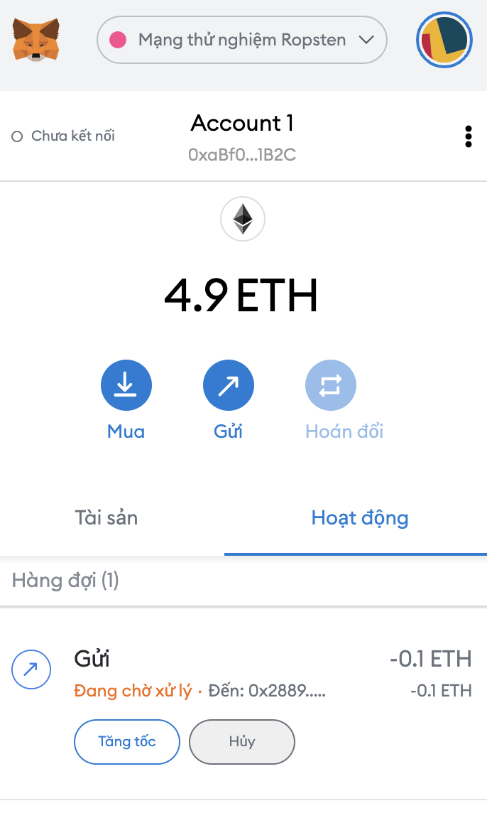 Sau khi anh em click "xác nhận" MetaMask sẽ gửi đi ETH, và anh em có thể nhìn thấy quá trình giao dịch của mình ở mục "Hàng đợi" trong tab "*Hoạt động" *