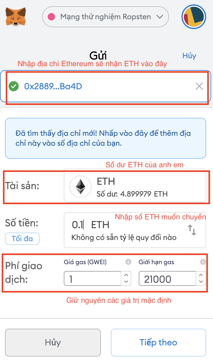 (Anh em hãy nhớ lại những gì tôi viết ở phần 1, ETH trong testnet cụ thể ở bài viết này là ropsten hoàn toàn không có giá trị, chỉ dùng để test).