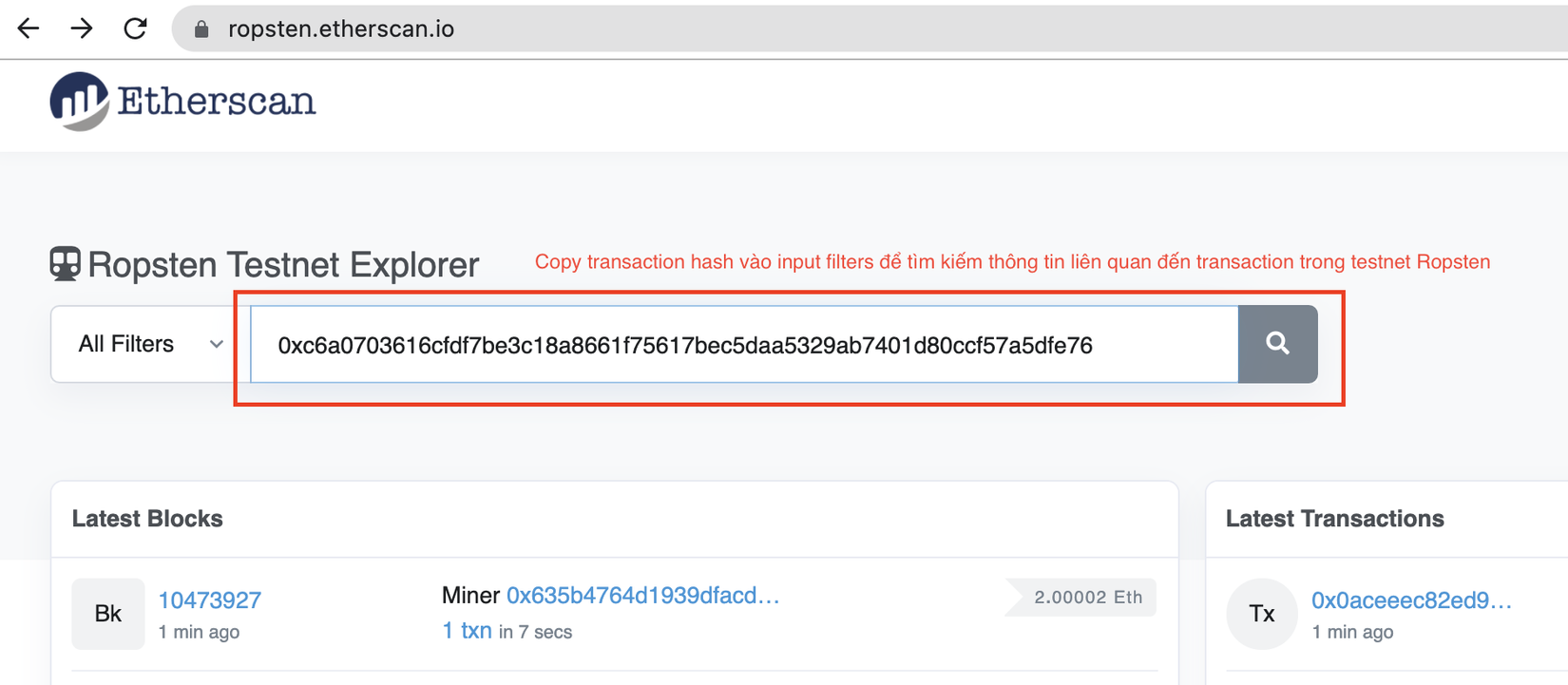 Hoặc có 1 cách khác để anh em xem thông tin liên quan đến 1 transaction là bằng cách truy cập vào https://ropsten.etherscan.io/ (đối với mạng testnet Ropsten còn với các testnet khác or mainnet sẽ là những trang khác) và copy transaction hash mà anh em muốn xem thông tin của transaction vào để tìm kiếm thông tin (ảnh dưới).