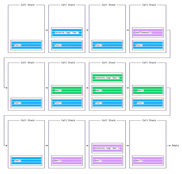 Khi hàm setTimeout, trình duyệt hoặc Node.js sẽ bắt đầu một timer. Khi timer hoàn tất (trong trường hợp của chúng ta là ngay lập tức vì chúng ta truyền 0 là thời gian timeout), hàm bar() sẽ được đẩy vào Event Queue.