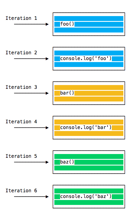 Qua đoạn code trên, ta có thể thấy fucntion foo() sẽ được gọi đầu tiên và trong đó nó sẽ gọi lần lượt hàm bar() rồi đến baz(). Ở thời điểm này, call stack sẽ như sau:
