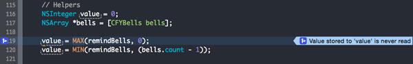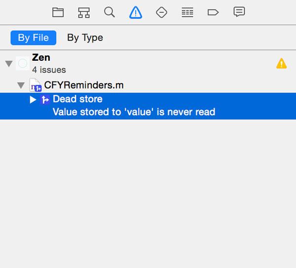 Để giúp bạn dễ tìm ra lỗi trong code thì có thể yêu cầu Xcode phân tích code của bạn để bạn có thể tìm được các vùng code có vấn đề. Để yêu cầu Xcode phân tích thì bạn hãy chọn Analyze trong tab Product trên thanh menu hoặc dùng tổ hợp phím tắt Shift-Command-B. Sẽ mất tời vài phút để thực hiện, sau khi hoàn thành các issue sẽ được hiển thị trong thanh navigation bên trái. Các vấn đề sẽ được bôi xanh lên.
