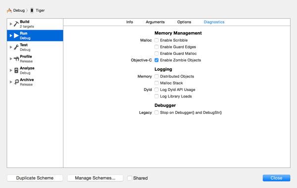 Kích hoạt Zombie trong Xcode rất là dễ dàng. Lưu ý điều này có thể khác nhau với từng phiên bản Xcode mà bạn đang sử dụng. Bạn hãy chọn vào scheme ở góc trên bên phải chọn Edit Scheme Chọn Run và sang tab Diagnosticsvà tick chọn Enable Zombie Objects.