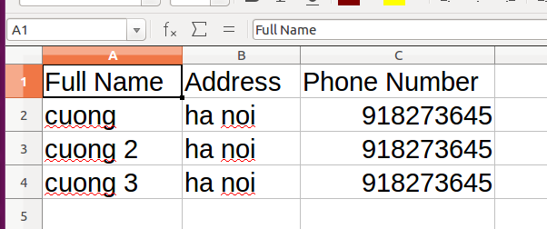 Mình sẽ demo một ví dụ đơn giản là export dữ liệu người dùng bao gồm các thông tin: tên, số điện thoại, địa chỉ.