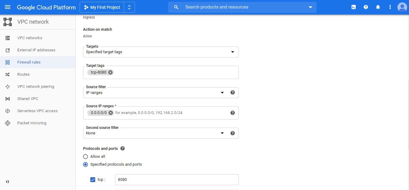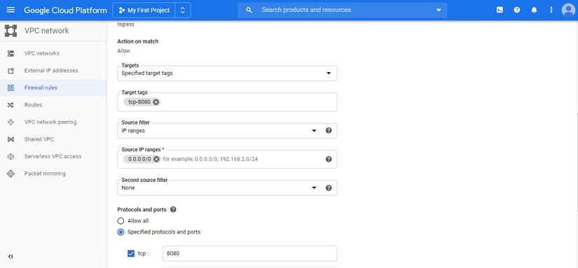 Thêm một firewall rule tại mục: VPC network > Firewall rule > CREATE FIREWALL RULE