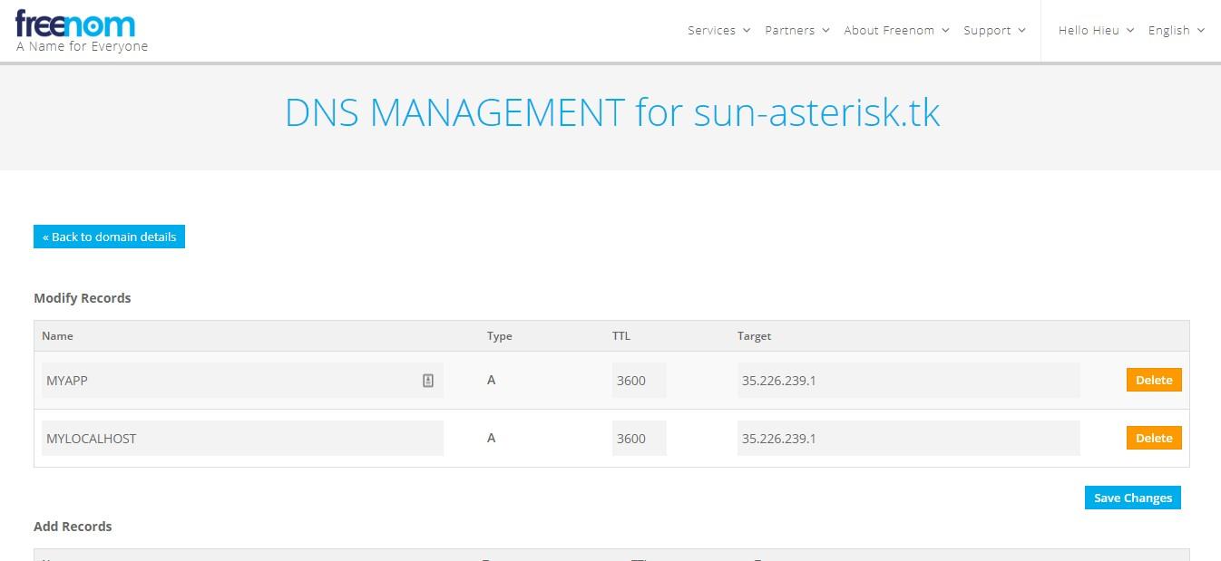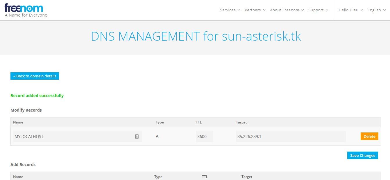 Sau khi tạo một tên miền mới, hãy thực hiện trỏ domain này về public IP của remote server.