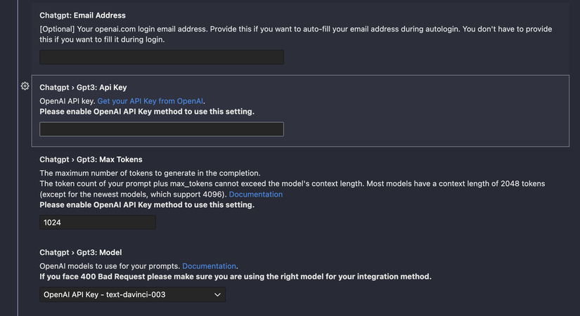 - Quay trở lại VSCode, vào Extension Setting của extension ChatGPT vừa cài đặt lúc nãy, kéo xuống tìm mục "Chagpt > gpt3: Api Key" và paste đoạn key lúc nãy vào. Vậy là xong. Bạn có thể bắt đầu code thần sầu với chatGPT ngay bên cạnh rồi 🥰😍