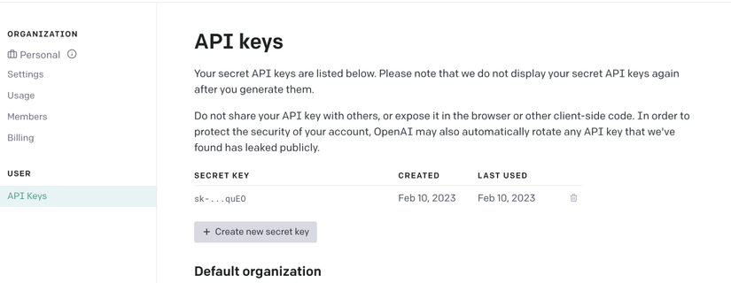- Ở màn hình Account API Keys, chọn "Create new secret key", sau đó copy đoạn key được hiển thị