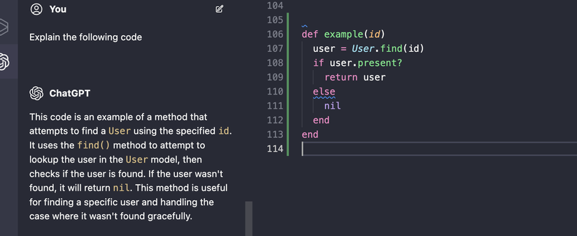Như ở ví dụ trên, mình code tào lao 1 đoạn như vậy, để xem thử con Bot được tích hợp này sẽ xử lý như thế nào nhé. Đầu tiên mình sẽ cho nó giải thích đoạn code, lúc này một cửa sổ trò chuyện nhỏ sẽ xuất hiện bên trái, ở đây chúng ta có thể tương tác với ChatGPT giống như phiên bản web: