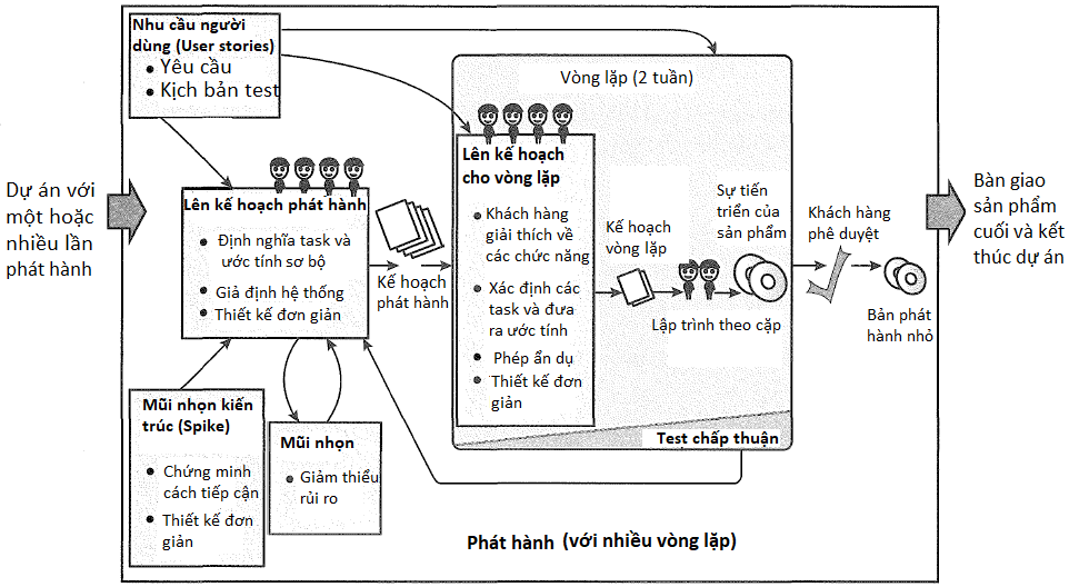 Như mô tả trong biểu đồ trên, đội dự án (XP team) dựa trên “nhu cầu của người dùng” (được gọi là User stories) để lên kế hoạch cho các phát hành và vòng lặp (Iterations). Vòng lặp thông thường kéo dài 2 tuần, lập trình viên làm việc theo cặp để viết code trong suốt những vòng lặp này. Tất cả các phần mềm phát triển đề được kiểm tra nghiêm ngặt và thường xuyên. Sau đó, khi được khách hàng phê duyệt, phần mềm được phân phối dưới dạng các bản phát hành nhỏ.
