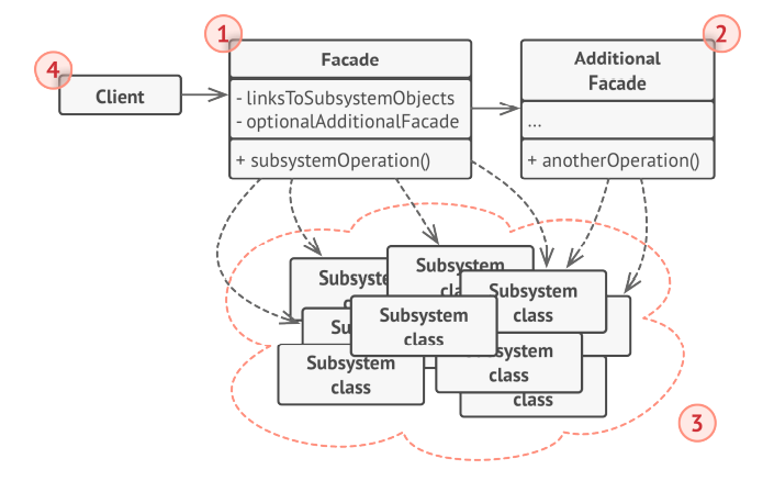 - Addition Facade: có thể được tạo ra để tránh việc làm phức tạp một facade. Có thể được sử dụng bởi cả client và facade.