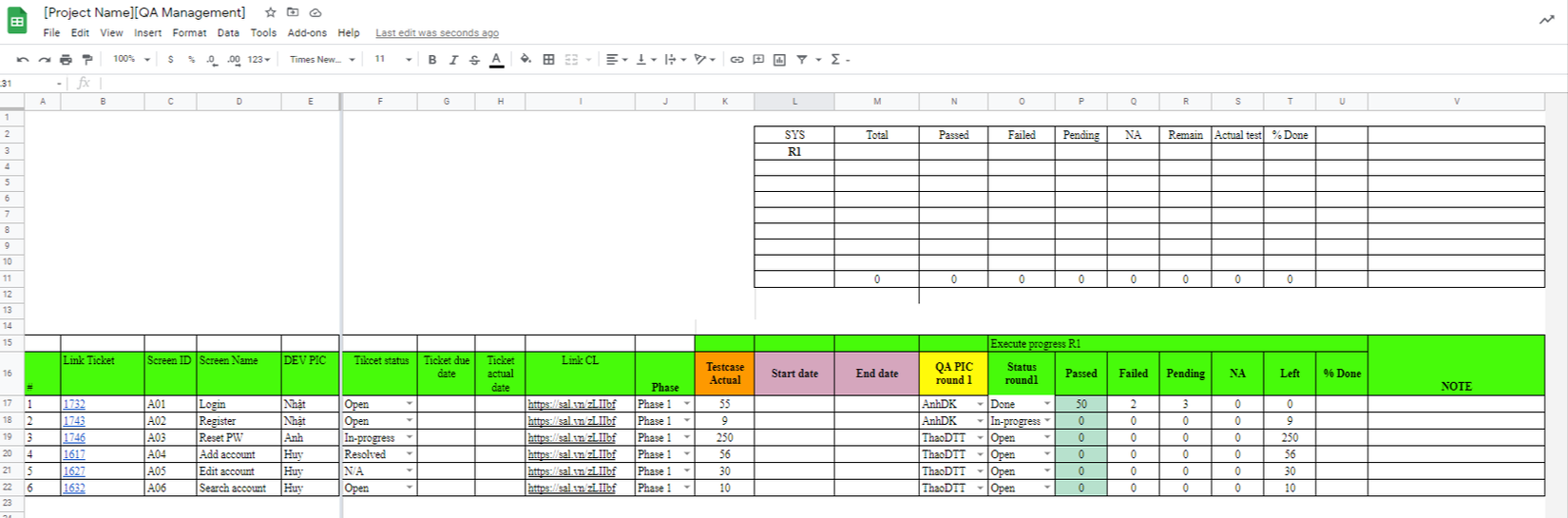- Result test (Passed/Failed/Pending/N.A/Remain => Thể hiện số case của từng màn hình đang ở trạng thái gì và giúp Manager của bạn có cái nhìn tổng thể 1 cách dễ dàng hơn để có thể lên plan OT nếu màn đó còn nhiều bug hoặc chậm deadline đã commit với khách hàng)