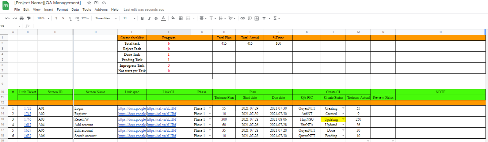 File QA Management này không chỉ giúp cho QA team quản lý các task mình cần phải làm mà nó còn là 1 tài liệu để Manager hay Khách hàng của bạn có thể xem được plan rằng chúng ta đã làm được những gì với số tiền mà họ đã trả cho bên mình.