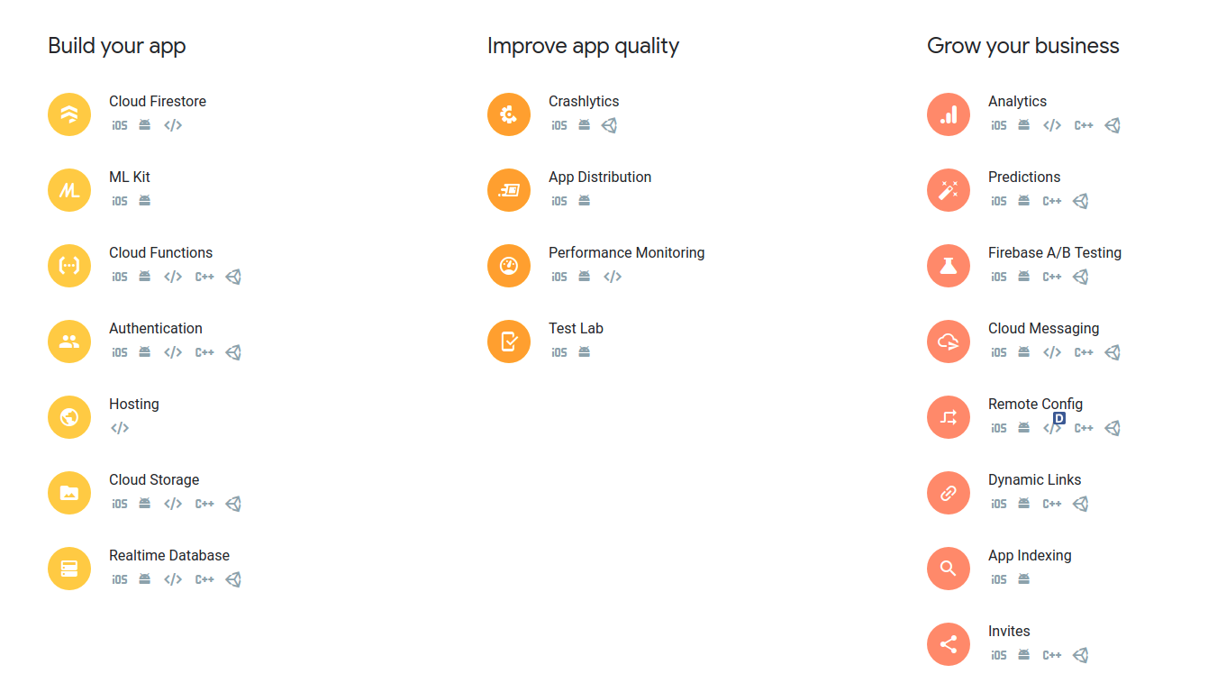 Hiện nay, danh mục dịch vụ của Firebase rất nhiều. Từ hệ thống chat thời gian thực, đến A/B testing… và cả ML KIT( Bộ công cụ phát triển Machine learning).