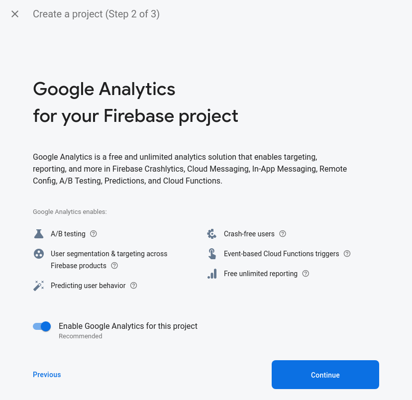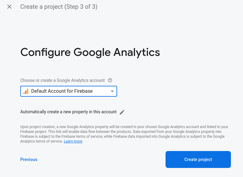 Nếu bạn muốn tích hợp cả Analytics thì cứ nhấn Continute thôi. Trường hợp có Analytics thì họ sẽ yêu cầu bạn chọn tài khoản cho Google Analytics, mình click chọn tài khoản mặc định rồi nhấn ** Create Project**.
