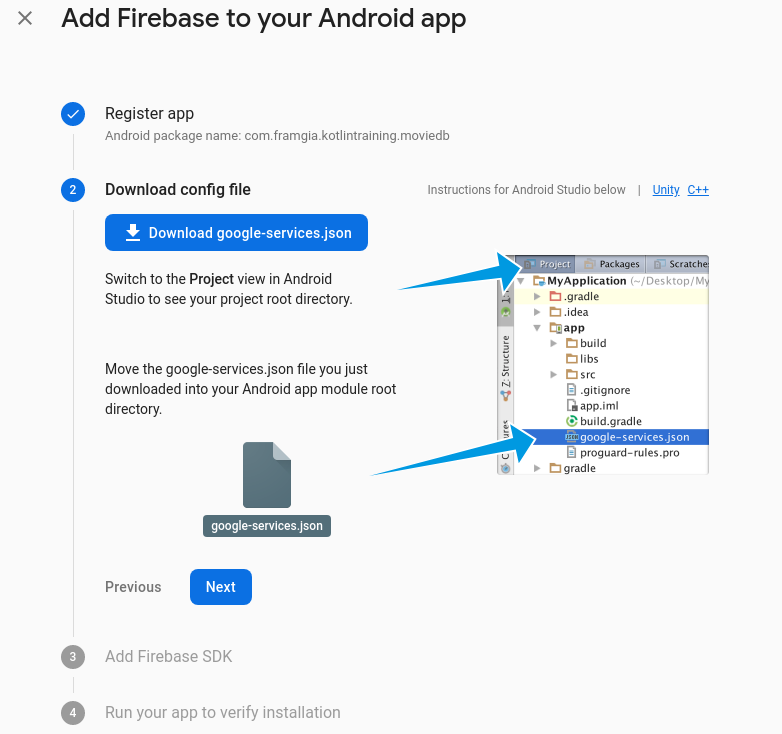 Sau khi làm xong B2 thì Firebase sẽ generate ra một file google-services.json, bạn hãy download file này về và ném vào thư mục app (như hình hướng dẫn):
