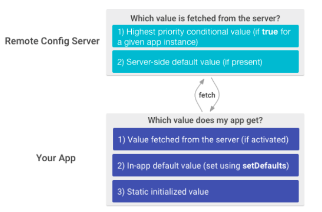 - Khi sử dụng các giá trị mặc định trong app, bạn sử dụng Firebase console hoặc Remote Config REST API để tạo các tham số có tên giống tên mà bạn sử dụng trong file mặc định dưới app. Với mỗi tham số, bạn có thể ghi đè giá trị dưới app từ server. Hình dưới đây cho thấy cách các giá trị tham số được ưu tiên trong Remote Config backend và trong ứng dụng của bạn: