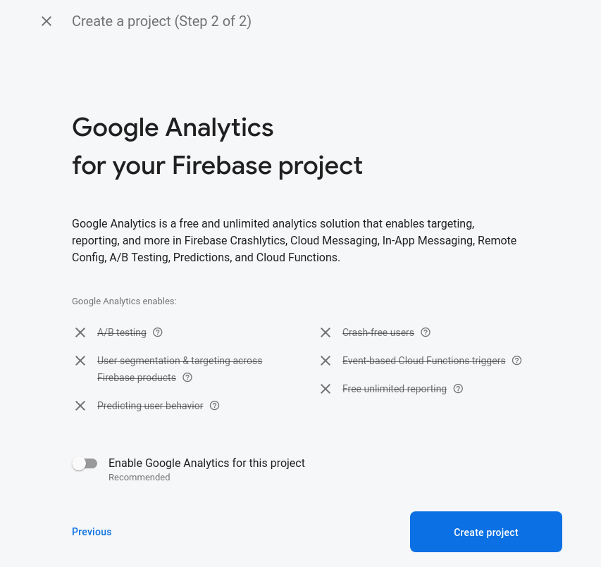 Bước này bạn có thể bỏ qua nếu như project không cần Analytics thì nhấn tắt cái switch button Enable Google Analytics for this project đi rồi nhấn ** Create Project**: