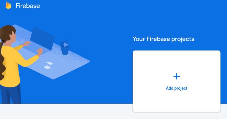 - Trước khi add Firebase vào Android app thì cần phải tạo một project trên Firebase để connect với Android app . Click button Add your project như trong hình: