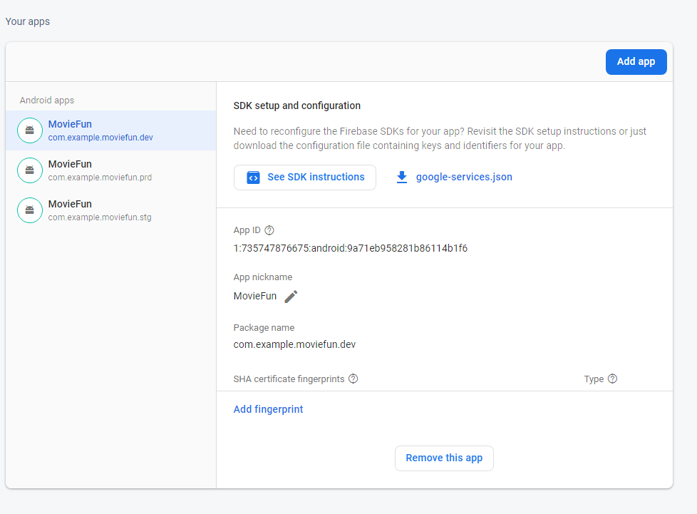 - Ở đây mình có 3 môi trường để build: dev, stg và prd. Vậy mình sẽ thêm 3 app vào project trên Firebase mình vừa tạo. Bằng cách vào Firebase Console: chọn Project settings -> General, ở đây mình cuộn xuống phần Your apps và tạo thêm các app cho từng môi trường tương ứng với từng package name, ví dụ mình tạo 3 app dưới đây:
