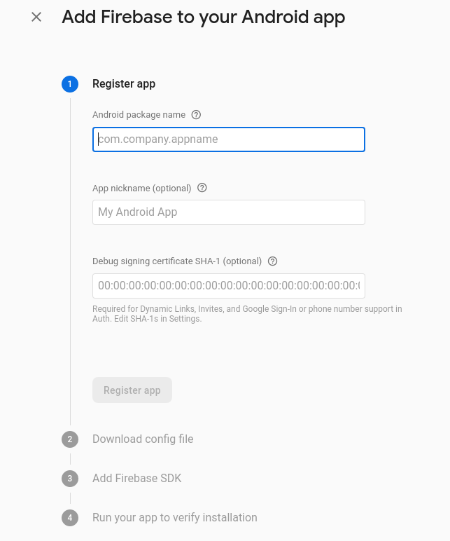 Sau khi có Firebase Project thì bạn có thể add Android app vào nó rồi.