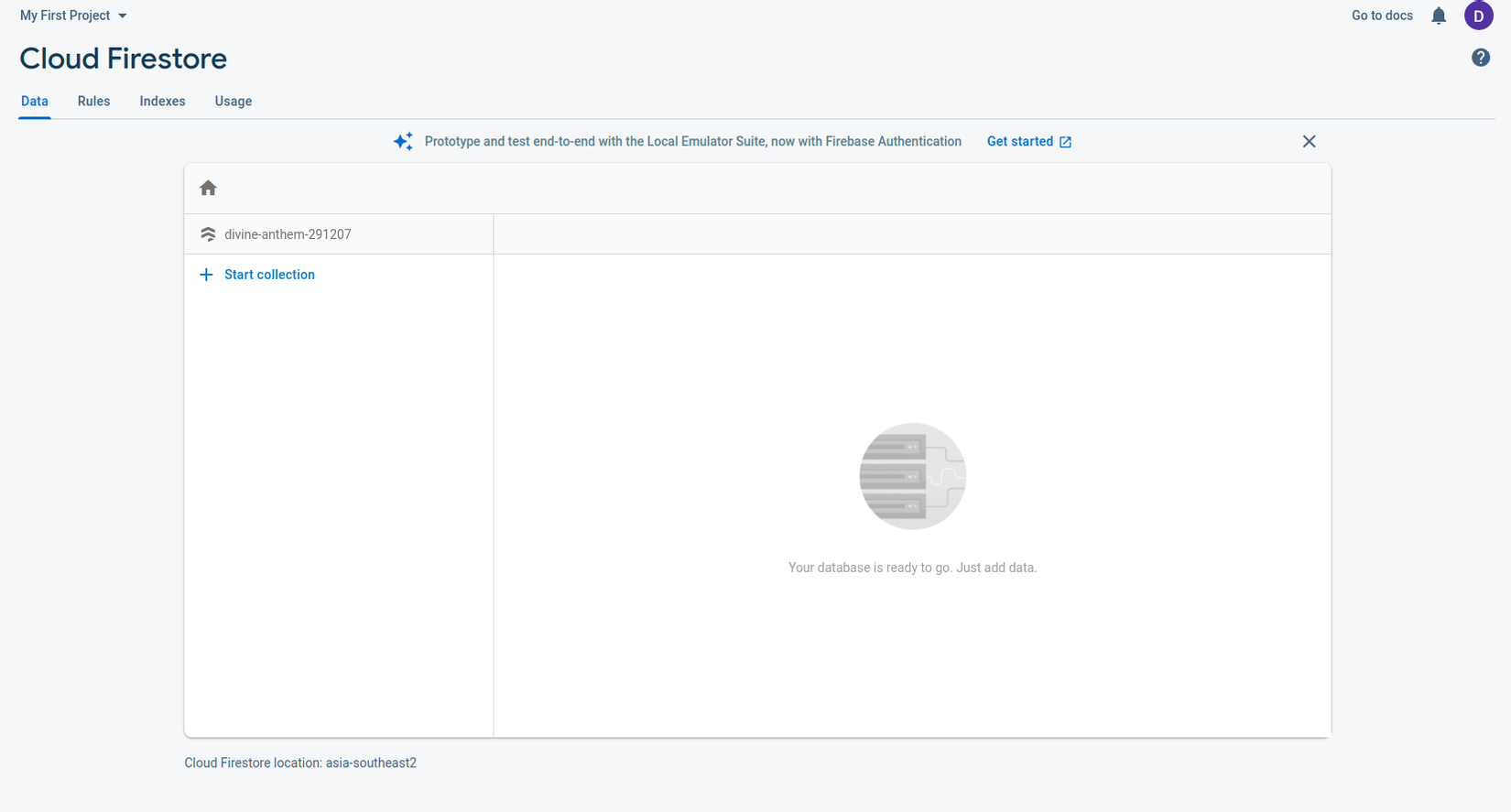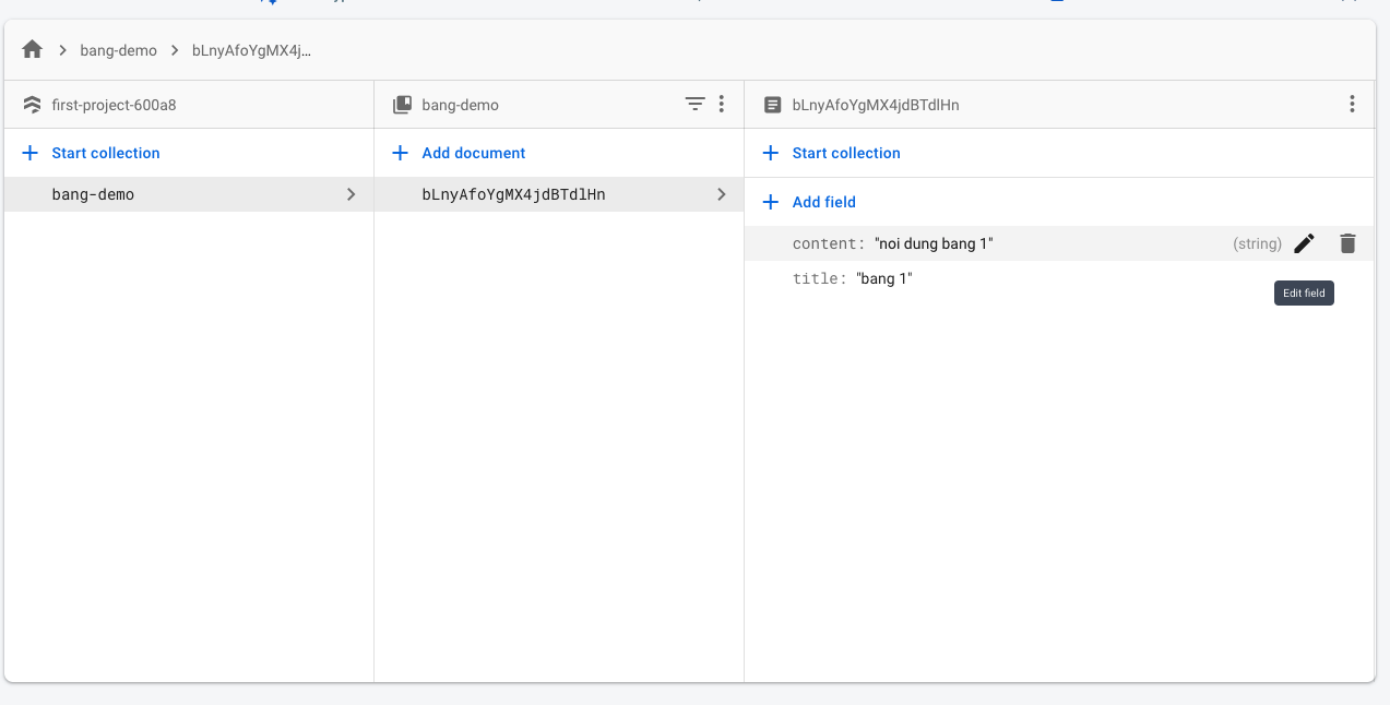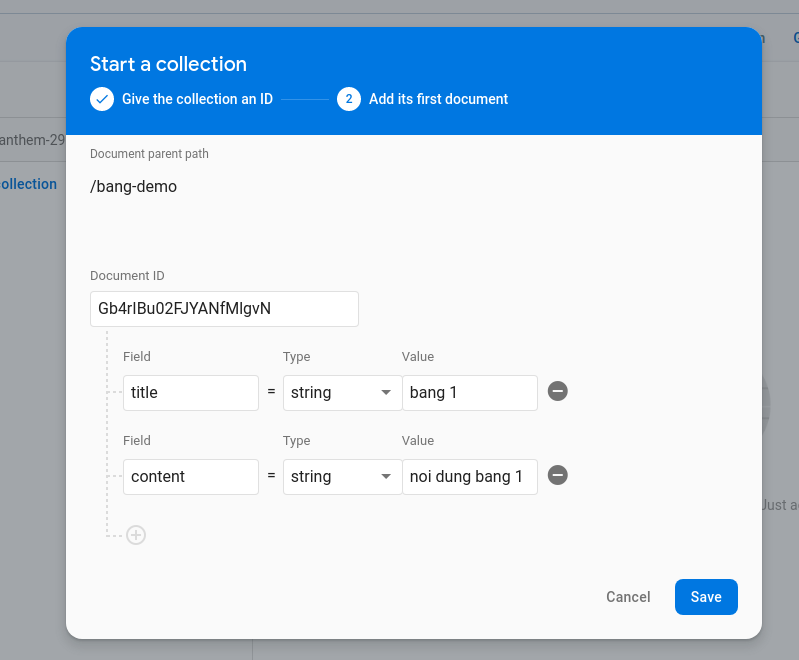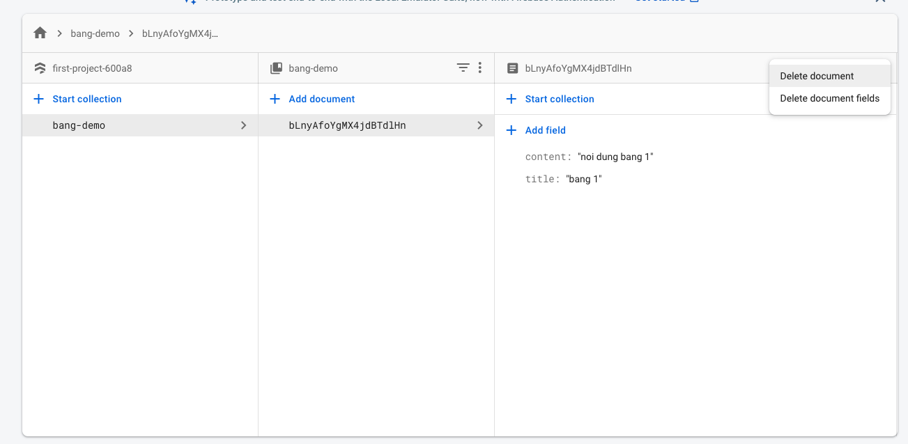 - Tại giao diện này chúng ta chọn Start collection để tạo bảng và thêm demo 1 dữ liệu cho bảng: