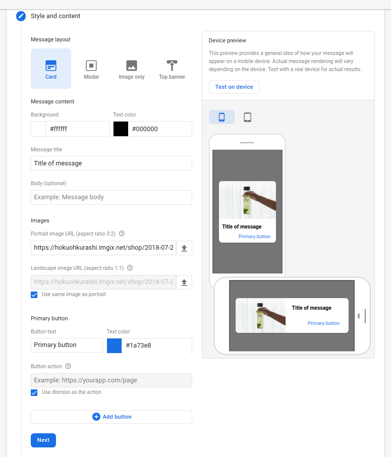 Step 1: Style and content Trong bảng điều khiển, hãy sử dụng các mẫu tin nhắn FIAM (card, modal, banner, image only) để kết hợp các tính năng khác nhau nhằm phục vụ các mục đích khác nhau trong ứng dụng của bạn.