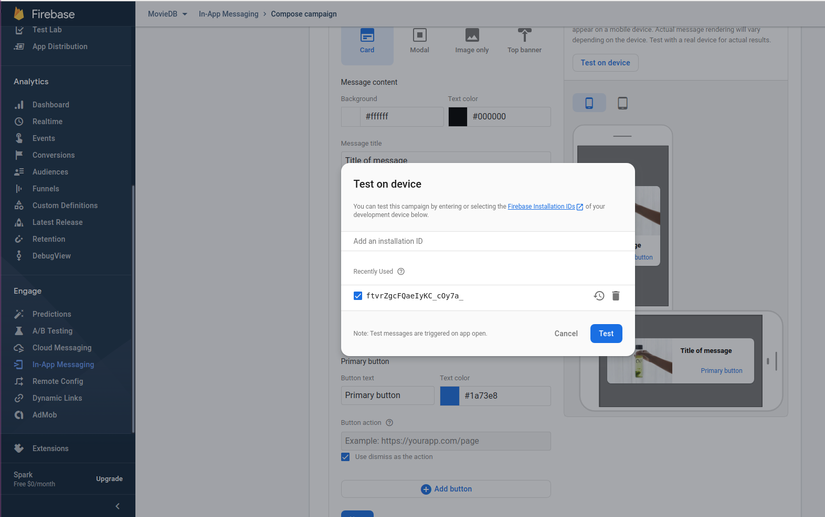 Trên trang Firebase In-App Messaging của Firebase console: