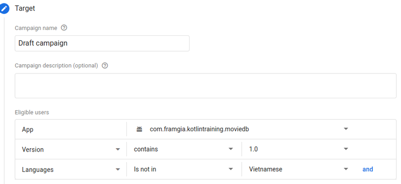 - (Tùy chọn) Nếu ứng dụng của bạn nhắm mục tiêu người dùng bằng nhiều ngôn ngữ, bạn sẽ được nhắc việc bản địa hóa chiến dịch bằng các ngôn ngữ đó. Sử dụng hộp thoại để thêm bản dịch của riêng bạn hoặc sử dụng Google Dịch để bản địa hóa chiến dịch một cách dễ dàng.