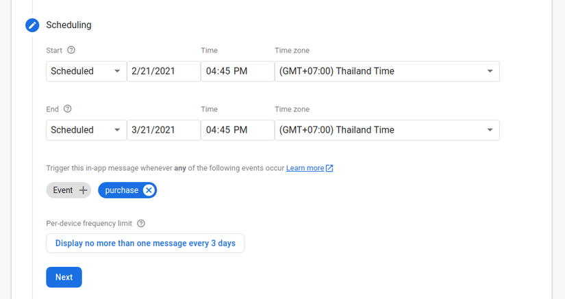 - Chỉ định giới hạn tần suất trên mỗi thiết bị của bạn: Giới hạn cho phép bạn kiểm soát tần suất người dùng xem tin nhắn của bạn. Theo mặc định, một chiến dịch không được hiển thị sau khi nó đã được người dùng xem một lần, hoặc bạn có thể đặt tần suất tin nhắn theo ngày.