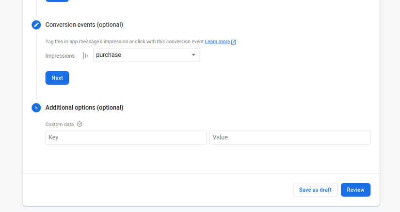 Step 4: Chuyển đổi các sự kiện (optional) Firebase theo dõi số lần hiển thị dẫn đến một sự kiện chuyển đổi hoàn tất. Ví dụ bạn lựa chọn sự kiện chuyển đổi là purchase khi user click vào thông báo từ FIAM, lúc này firebase sẽ đếm số lần chuyển đổi thành công từ thông báo FIAM tới khi user lựa chọn các thao tác để đi tới event purchase. Từ đó có thể tính được mức độ thành công (số lượt chuyển đổi trên tổng số thông báo FIAM) của campaign lần này.