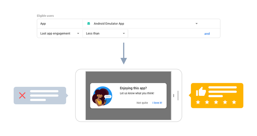 - Nhắm mục tiêu người dùng có tương tác với ứng dụng gần đây nhất trong khoảng từ một đến bảy ngày để đảm bảo họ đang hoạt động. Hỏi những người dùng thân thiết của bạn xem họ có thích ứng dụng của bạn không. Tùy thuộc vào câu trả lời của họ, hãy sử dụng deeplink tới Google Play để xem xét hoặc khảo sát phản hồi của họ.