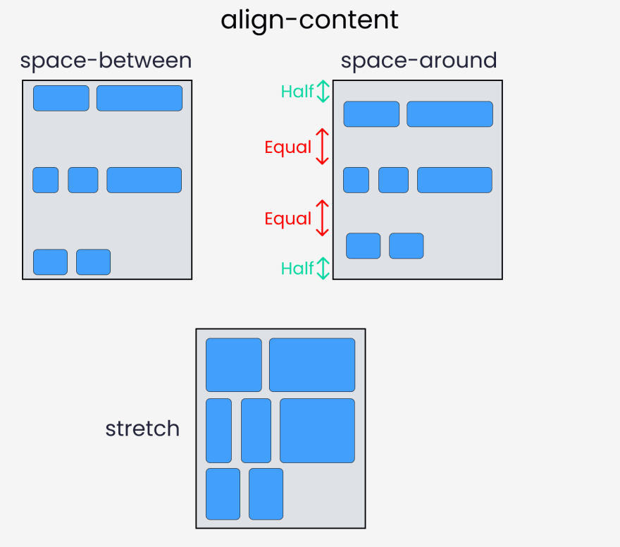 Thuộc tính này sử dụng để căn chỉnh khoảng cách các item bên trong container dọc theo trục cross axis, chiều ngang hoặc chiều dọc tùy thuộc vào flex-direction.