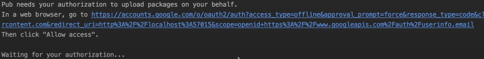 Tiếp đến nếu bạn chưa upload lần nào lên pub.dev, terminal sẽ hiện lên 1 link, bạn click vào link này để mở trình duyệt và chọn tài khoản google bạn muốn quản lý thư viện