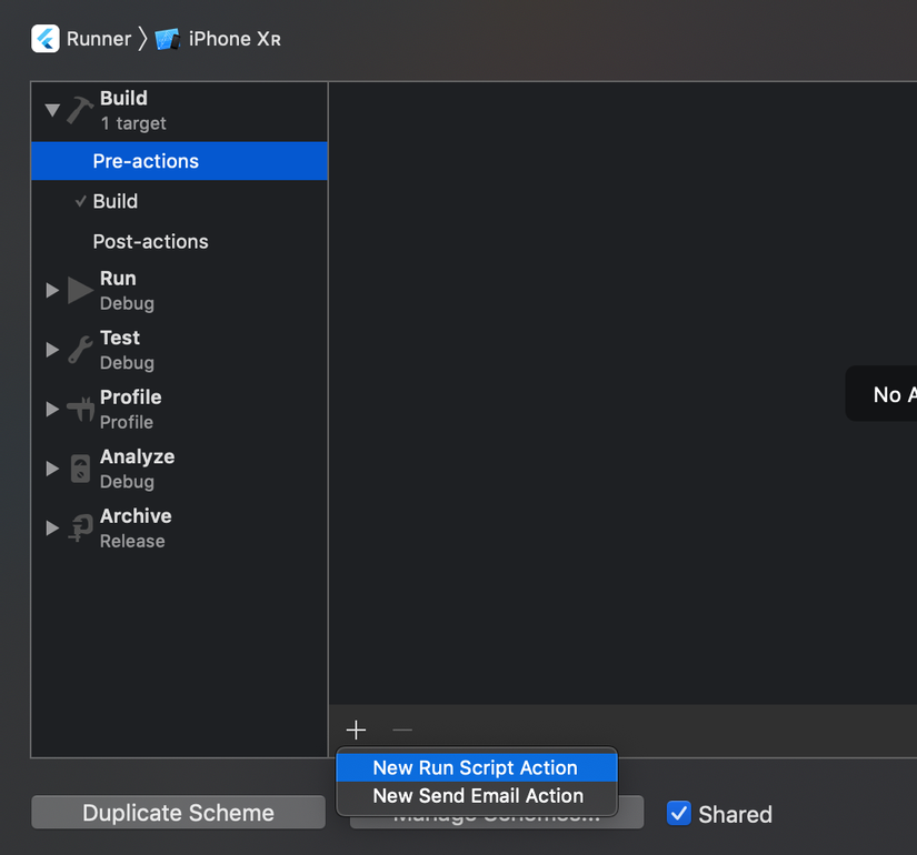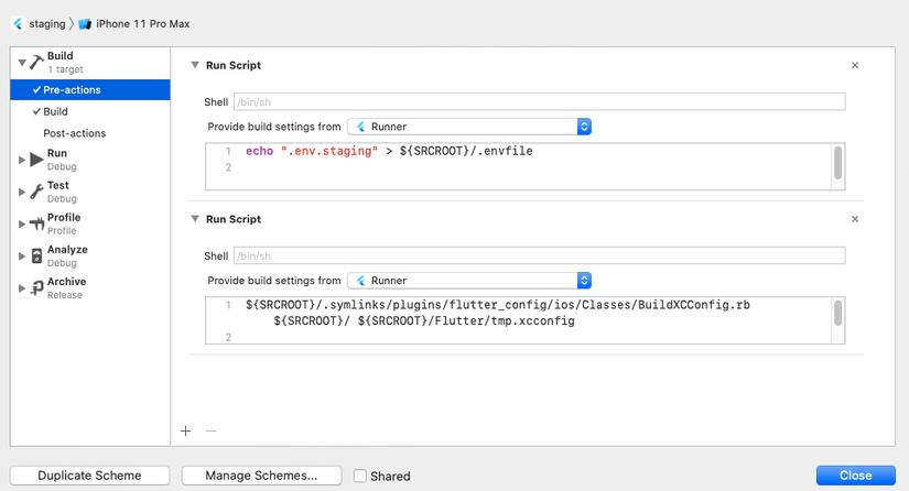 Chọn Build -> Pre-actions, và add thêm 2 "New Run Script Action", theo đoạn code sau:
