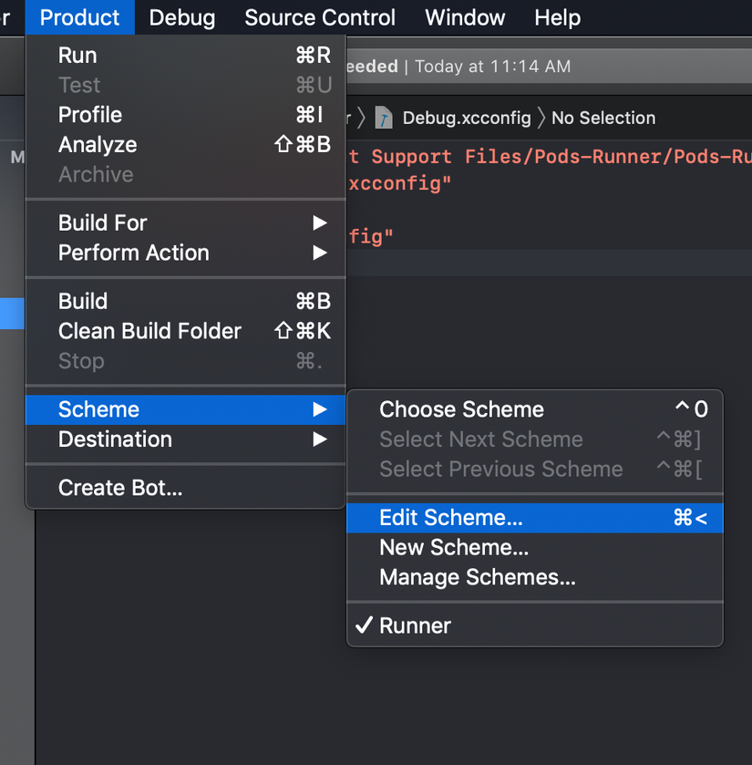- Trong menu của Xcode chọn Product > Scheme > Edit Scheme