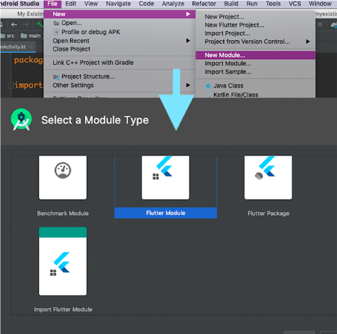 Flutter Module có thể được tích hợp vào bằng 2 cách: Create New hoặc import Module Flutter từ Android Studio