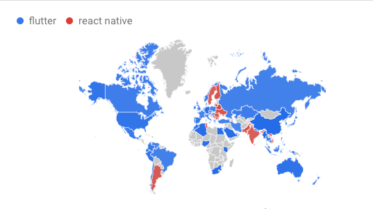 Theo thống kê của Google đối vs Flutter và RN thì Flutter đã dần vượt lên RN về mức độ sự quan tâm và tìm kiếm.