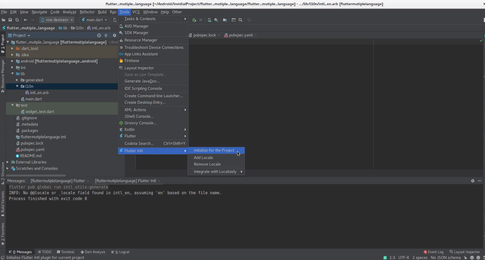 - Sau khi tạo project xong. Trên thanh công cụ android studio bạn chọn Tools -> Flutter Intl -> Initialize for the Project để plugin tiến hành generate ra các file cần thiết nhé