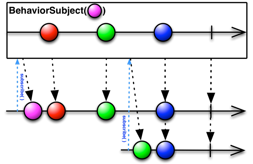 BehaviorSubject: Một trong các biến thể của Subject đó là BehaviorSubject, nó là biến thế có khái niệm về “the current value”. BehaviorSubject lưu trữ lại giá trị mới emit gần nhất để khi một Observer mới subscribe vào, nó sẽ emit giá trị đó ngay lập tức cho Observer vừa rồi.