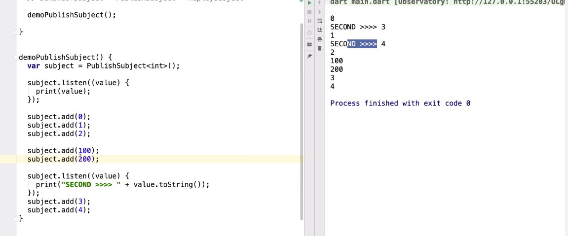 Hãy cùng quan sát kết quả khi chạy đoạn code trên: Ỏ lần listen thứ 2 nó chỉ nhận giá trị cuối là 2 và bỏ qua 2 giá trị phía trước là 0 và 1