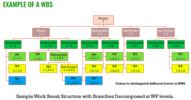 Việc tạo WBS sử dụng 1 kĩ thuật gọi là "phân rã theo cấu trúc phân tầng" (Hierarchical structure) . Sử dụng cách này có thể tạo ra được các Work Pakage có thể ước tính được chi phí và thời gian làm việc.