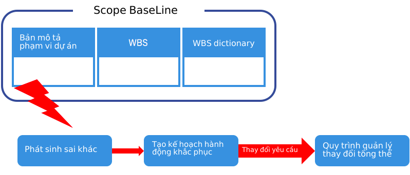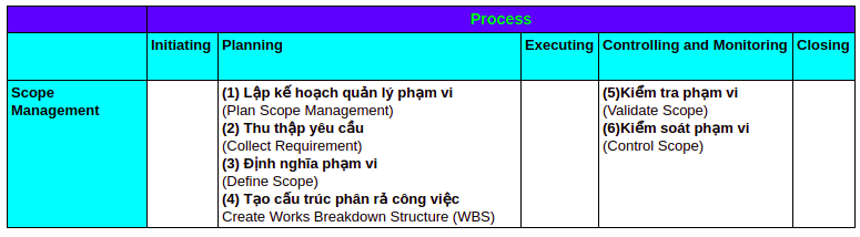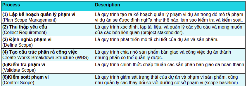Như hình vẽ ở trên đã mô tả, Quản lý phạm vi có 6 quy trình công việc được triển khai như sau