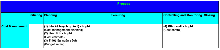 Nhìn từ góc độ quá trình, quản lý chi phí được nằm trong nhóm quá trình lập kế hoạch và nhóm quá trình giám sát / kiểm soát.